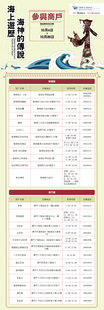 海上遊歷海神的傳說現金劵–商戶名單 日期 10 月 04 2025 - 10 月 26 2025 進行中... Time 整天 標記 免費 組織者 澳門廟宇節慶文化促進會 電話 28259897 郵箱 macautemple530@gmail.com